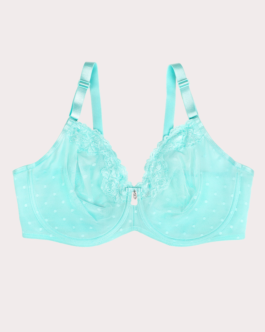 Playful textures of soft dot mesh on cups & floral scalloped laceLess sheer than traditional mesh due to dot lace patternFull coverage, lightweight and breathable mesh fabricNo padding. Two layers of sheer mesh cups lift, shape and supportFloral scalloped lace along the neckline contours your natural bust shapeFront strap adjustment to easily customize your fit with fully adjustable strapsLuxe power mesh wings offer back-smoothing and breathabilityAvailable in C-G & H cups and 34 - 46 bands