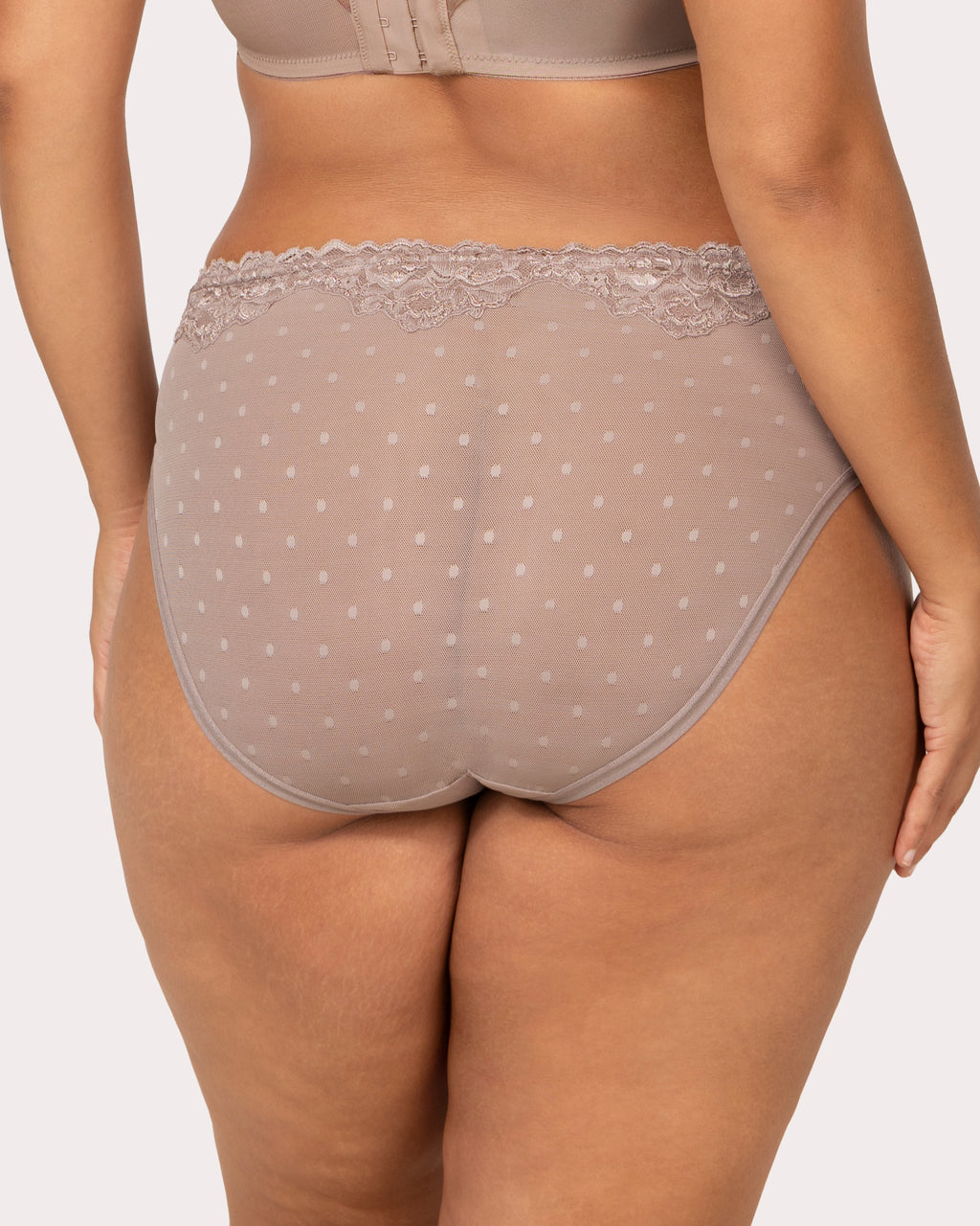 It’s giving main character energy with a perfect mix of comfy and cheeky! Ultra smooth dotted lace with a flat finish for comfort and easy wear under clothes. Lightweight and breathable, these gorgeous panties move with you throughout the day. A classic underwear style designed specifically with plus size bodies in mind. No pinching or digging, our soft Sheer Whisper High Cut Brief feels second skin. Have fun with sexy plus size panty options for everyday wear or date night. Pair with our Sheer Whisper bras for an unforgettable sexy set, or with no bra at all. Feel your best underneath with Curvy Couture.