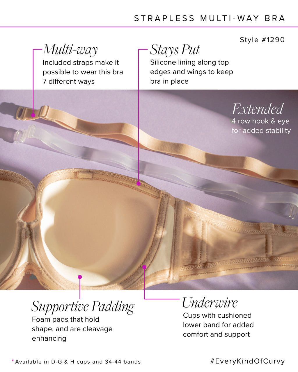 Our smooth multi-way plus size strapless bra with 7 ways to wear, creates the sensational lift-loving shape that you crave. Contoured cups offer targeted shaping with push-up and support just where you need it. Engineered to stay in place. We've designed this bra especially to support your curves, no matter what you're wearing over it.